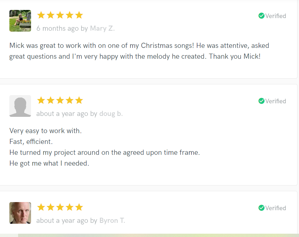 “Mick is an excellent songwriter and worked quickly on my project!” -Chad W.